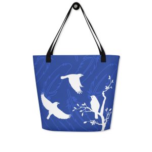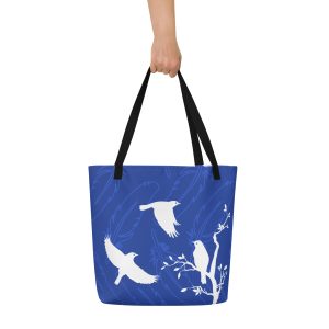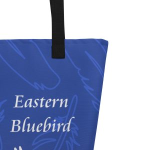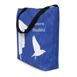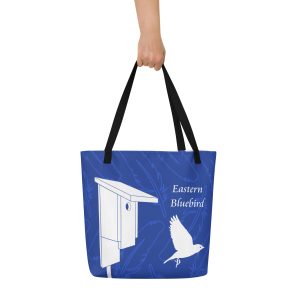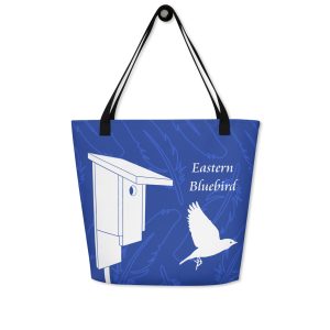 We created this tote to celebrate the Eastern Bluebird and the conservation efforts of many organizations. This trendy tote has an inside pocket and holds plenty of books, clothes, or whatever you fancy. Need a place to stow your binoculars and bird ID book? This tote can handle it. Bird lovers of all kinds will appreciate the Bluebirds in flight in this design. With a nest box on one side and a tree on the other, our illustrated Bluebirds have everything they need to call home.